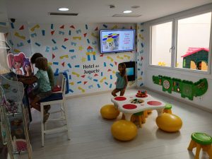 En la planta baja, junto a recepción, encontrarás unas mesas donde puedes disfrutar de juegos de mesa que te prestan amablemente. Ideal para una tarde tranquila en familia. Si te adentras un poco más, descubrirás unas escaleras que llevan a la ludoteca. Este espacio es un paraíso infantil: disfraces, futbolín, dibujo y hasta monitores que organizan actividades. Y si necesitas vigilarlos desde la distancia, hay televisión para que no pierdas de vista a tus peques.